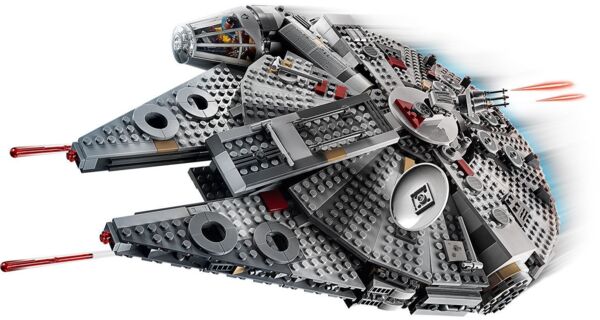 - Зовнішні особливості моделі LEGO® Star Wars ™ Millennium Falcon включають обертову верхню і нижню турель-гармати (нижня турель підходить для 2 мініфігурок), 2 пружних стрілка, опускні рампу і відкривається кабіну з місцем для 2 мініфігурок.