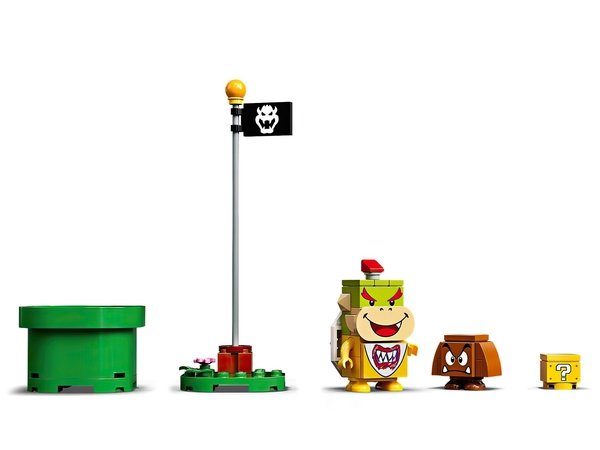 - У цьому суперкруті наборі Маріо LEGO буде збирати віртуальні монетки, добираючись від стартової труби до фінішу по кубиках LEGO, хмарним платформ, підбиваючи головою блоки із зображенням знака питання і борючись з гумбо і Боузер-молодшим.