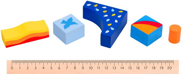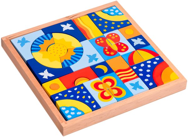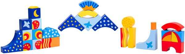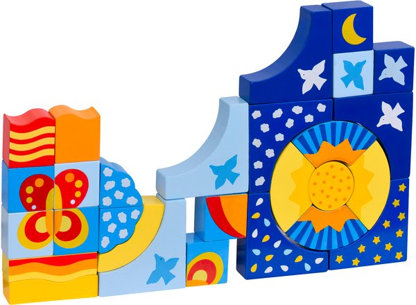 Конструктор тренує дрібну моторику, логіку, а також уяву дитини. Зроблений з натурального матеріалу – дерева, тому він безпечний для маленьких дітей. Складається з 41 деталі з різними малюнками та візерунками. З конструктором можна грати як з пазлом і збирати малюнки, які задумали дизайнери, а також використовувати як доповнення до інших дерев'яних іграшок.