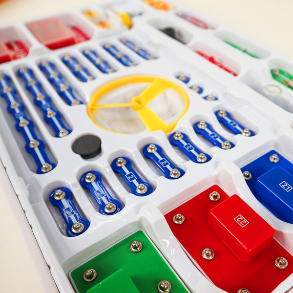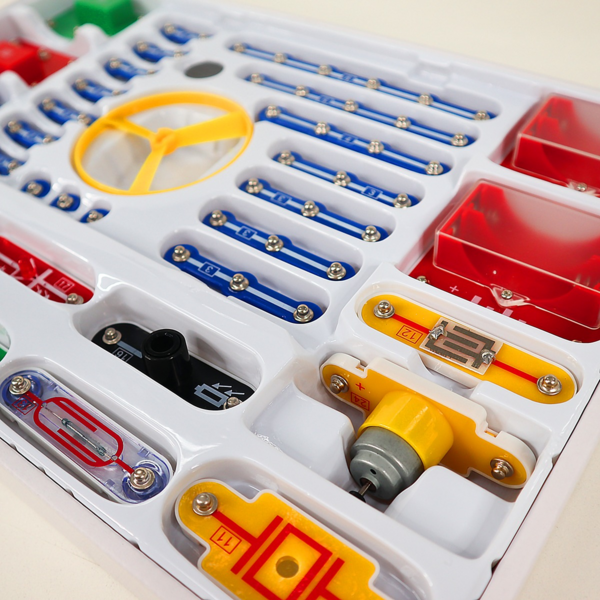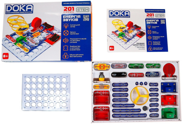 Конструктор електронний Doka "201 Схема" безсумнівно сподобається юним дослідникам. Конструктор дає змогу дитині своїми руками створювати музичні дзвінки, охоронні сигналізації, імітатори звуків, автоматичні освітлювачі, а також кумедні ігри та іграшки. Завдяки оригінальному способу з'єднання деталей ви зможете домогтися швидкого та ефективного результату без використання паяння. До комплекту також входить інструкція, за допомогою якої дитина зможе зібрати 201 електросхему, що дає змогу на практиці освоїти ази керування світлом, звуком, електрикою і водою. За допомогою цього конструктора можна зібрати такі схеми: літаючий пропелер, лампа із сенсорним і світловим керуванням, керовані звуки зоряних воєн, пожежної машини або швидкої допомоги, музичний вентилятор, мерехтливий світлодіод із магнітним керуванням, тестер електропровідності, вентилятор із сенсорним і магнітним керуванням, музичний дверний дзвінок, лампа зі зміною яскравості, логічні елементи «І», «АБО», «І-НІ», «АБО-НІ», «АБО-НІ» та багато іншого. Для роботи потрібні 4 батарейки типу АА (не входять до комплекту).