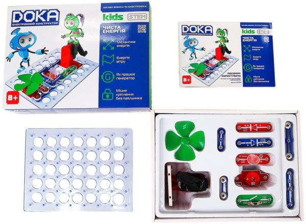 Конструктор електронний Doka «Чиста енергія» безсумнівно сподобається юним дослідникам. Конструктор дає змогу дитині власноруч створювати механічну енергію, допоможе в знайомстві з логічними елементами та ручним генератором, регулювати енергію вітру. Завдяки оригінальному способу з'єднання деталей ви зможете домогтися швидкого та ефективного результату без використання пайки. Цей набір чудово підійде як для індивідуальних занять у спокійній домашній обстановці, так і для занять додаткової освіти. Для роботи не потрібні батарейки.