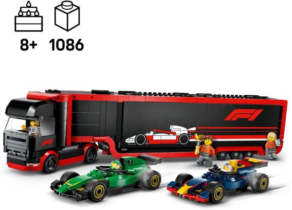 Опис LEGO 60445 City Вантажівка F1 з автомобілями RB20 та AMR24