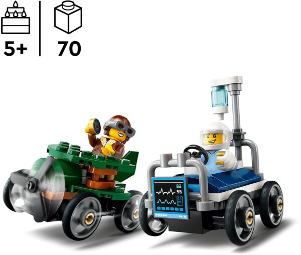Цей цікавий набір для автомобільних перегонів має 2 безмоторні транспортні засоби й 2 мініфігурки. Діти можуть виставити пілота в літаку, що злітає, проти пацієнта на напрочуд швидкому лікарняному ліжку. Хто переможе? Займайте своє місце для легендарних міських перегонів!