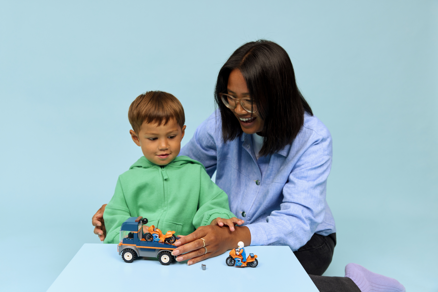 Познайомте дітей віком від 4 років зі світом творчої та захопливої гри разом із набором LEGO City "Транспортер мотоциклів". Цей набір іграшкових транспортних засобів включає: іграшкову вантажівку з плоским кузовом та масивними гумовими колесами, 2 іграшкові спортивні мотоцикли та 2 мініфігурки гонщиків у шоломах. Діти можуть завантажувати й розвантажувати мотоцикли за допомогою рампи, влаштовувати епічні мотоперегони та садити мініфігурку в кабіну вантажівки для веселих дорожніх пригод.