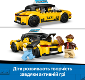 Діти від 5 років, які обожнюють машинки та конструктори, отримають подвійне задоволення з набором LEGO City "Жовте таксі". Цей веселий набір містить жовте таксі з сучасним дизайном електромобіля, багажник, що відкривається, з багажем, та капот, який підіймається, відкриваючи імітований електричний двигун. Набір комплектується наліпками із зображенням екрана GPS, логотипа таксі, реклами на даху та акумулятора. Діти також можуть зняти дах, щоб посадити мініфігурки водія таксі та туриста.