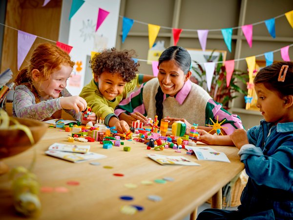 Сім'я та друзі разом будують швидкі та веселі моделі у цій соціальній будівельній активності LEGO для груп на будь-якому заході.