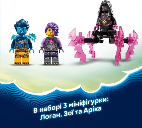 Мініфігурки Логана, Зої та Аріки, а також фігурка Грімспауна, 2 павуки та колекційна блакитна фігурка Скарбової істоти заохочують до творчої сюжетної гри. Логан має при собі колекційний синій меч, Зої — лук, а Аріка — косу.