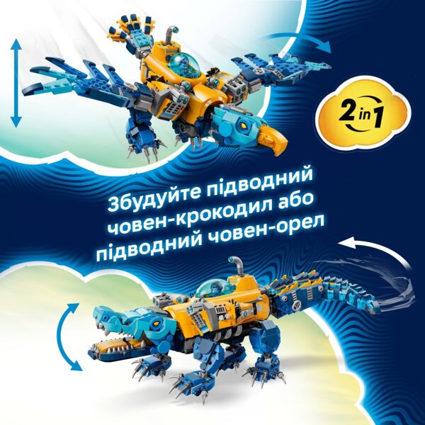 Діти можуть проявити свою творчість із набором для конструювання LEGO DREAMZzz "Підводний човен-крокодил" (71512) для хлопчиків та дівчаток віком від 8 років. Він пропонує 2 варіанти складання, що дозволяє перетворити іграшкову субмарину на крокодила або орла з рухомимми крилами.