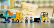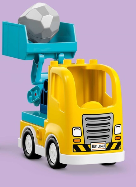 З 22 цеглинок цього конструктора LEGO DUPLO можна скласти 3 пари вантажівок: іграшковий навантажувач із відкидним ковшем, який наповнює самоскид цеглинами, екскаватор та евакуатор із обертовим кронштейном або ножичний підйомник та другий евакуатор із меншим гаком для підйому цегли.