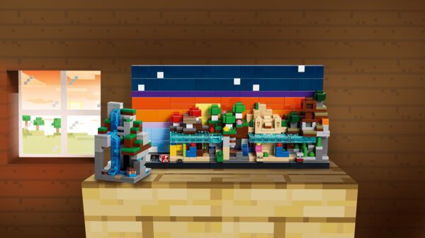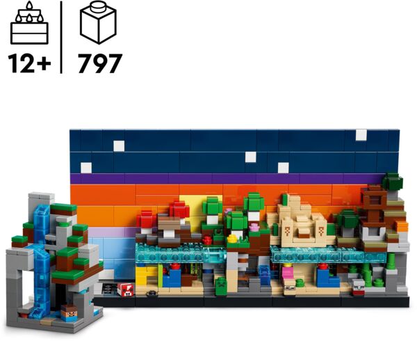 Набір LEGO Minecraft містить 5 знімних біомів: гора — з печерою з наростами, аметистовою жеодою й водоспадом, квітковий ліс — з печерою, лавою й золотом, грибні поля — з кораловим рифом, рештками затонулого корабля, 2 червоними грибними деревами та коричневим грибом, пустеля — з храмом, кораловим рифом, океаном, кактусами та скринею скарбів, а також савана — з форпостом мародерів, печерою з хащами, акацієвими деревами, гарбузом, лавою та пляжем. Набір також включає двосторонній фон (день/ніч).