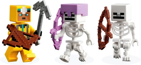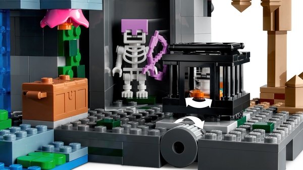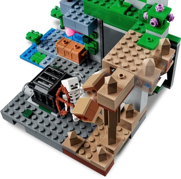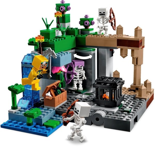 Цей універсальний ігровий набір дозволяє досліднику печери битися з ворожими скелетами в багатокомпонентному середовищі, що складається з краплинної печери зі сталагмітами і сталактитами; пишної печери з кущами, ліанами, водою, глиною та смолоскипами; і підземелля скелетів, яке включає обертовий респаун скелетів. Практичні дії включають натискання на сталагміт, щоб змусити камені обрушитися на ворожих мобів, і обертання стіни, щоб відкрити третій скелет. Зброя включає арбалет і кирку, а також скриню з музичною платівкою, хлібом та кісткою. Тут є все, що потрібно гравцеві Minecraft, щоб насолодитися нескінченними творчими пригодами!