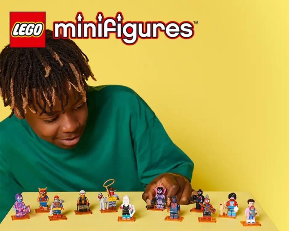 Набір мініфігурок LEGO з персонажами фільму «Людина-павук: Через всесвіт», кожна з яких знаходиться в таємничій коробці для гри та демонстрації.