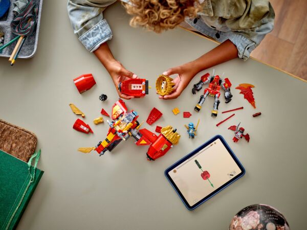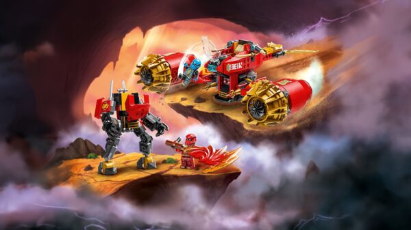 Комбінована іграшка "Штормовий робот-вершник Кая" дозволяє хлопчикам і дівчаткам віком від 7 років відтворювати захопливі сцени з 3 сезону серіалу Ninjago Dragons Rising. Діти можуть пограти з великою іграшкою, перш ніж розділити її на два менші транспортні засоби: робота Кая з рухомою головою, руками й ногами, кабіною пілота і великим аксесуаром у вигляді штормового меча, а також летючий мотоцикл Нії з кабіною, рухомими крилами й 2 шпильковими шутерами. Цей ігровий набір містить 3 мініфігурки Ninjago: Кая, озброєного 2 кришталевими катанами, Нію, озброєну 2 золотими катанами, і воїна-дракона із власним мечем, щоб діти могли розіграти сюжетні епічні битви.