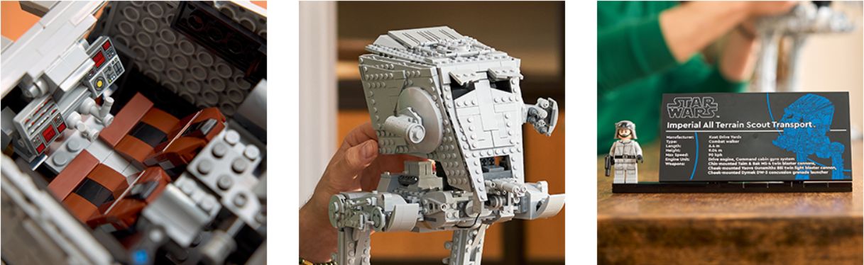 Налаштовуйте модель, обертаючи «голову» AT-ST, відкриваючи й закриваючи жалюзі над оглядовими вікнами й налаштовуючи лазерні гармати. Цей колекційний конструктор транспортного засобу оснащений інформаційною табличкою і унікальною мініфігуркою водія AT-ST серії LEGO Star Wars з імператорським гербом на руках, щоб надати кінцевий штрих драматичній центральній експозиції.