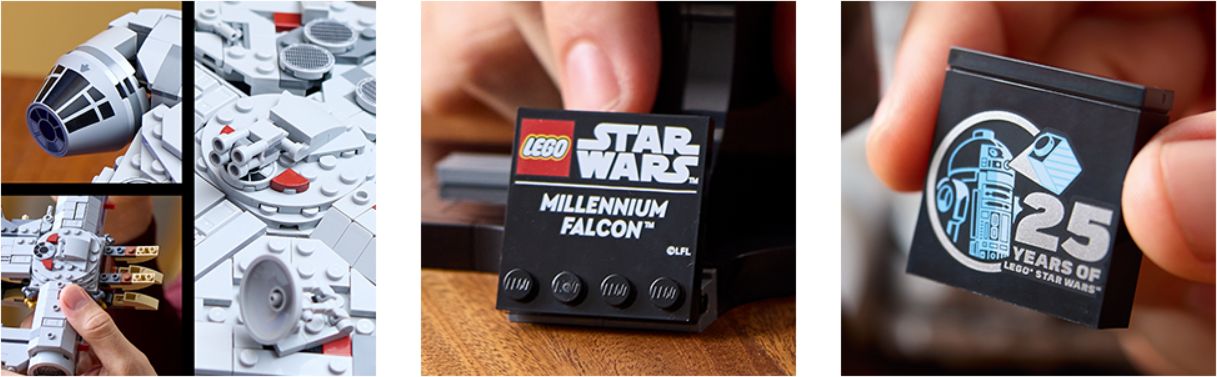 Розмістіть своє творіння на підставці, яка призначена для того, щоб демонструвати «Тисячолітній сокіл» під динамічним кутом, наче в польоті. Додайте табличку з назвою та цеглинку LEGO Star Wars, присвячену 25-річчю, щоб завершити центральний елемент, який обов'язково викличе ностальгічні спогади.