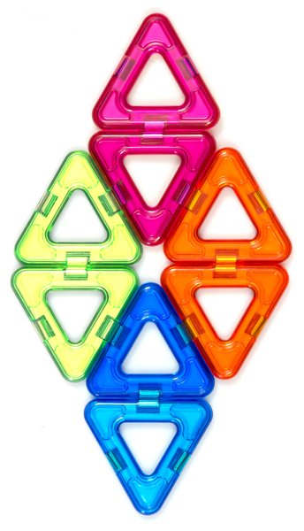 У конструктора фирмы Magplayer имеется дополнительный набор, состоящий из восьми элементов. У каждой детали форма в виде треугольника с небольшим отверстием посередине, а также яркий насыщенный цвет. Все они крепятся между собой имеющимся специальным магнитом, который прочно присоединяет их друг к другу. С помощью этого комплекта можно, включив фантазию, собрать все, что придет в голову. Превосходно заставляет работать воображение и развивает творческий подход. Будет крайне интересно составлять различные оригинальные фигурки своими собственными руками. Покупку порекомендовала моя сестра недавно, на данной торговой площадке случайно увидела и купила.
