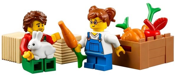 Що в коробці? Все, що потрібно дитині, щоб зібрати крутий іграшковий трактор з безліччю реалістичних функцій, а ще 2 тюка сіна, ящик з овочами, мініфігурки фермера і його дочки і фігурка кролика.