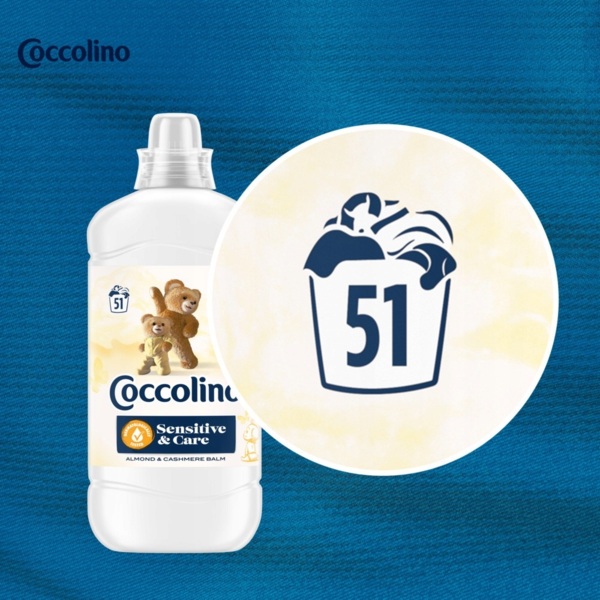 - Концентрований кондиціонер для білизни Coccolino для чутливої шкіри з нотами мигдалю та кашеміровим бальзамом, 1,275л