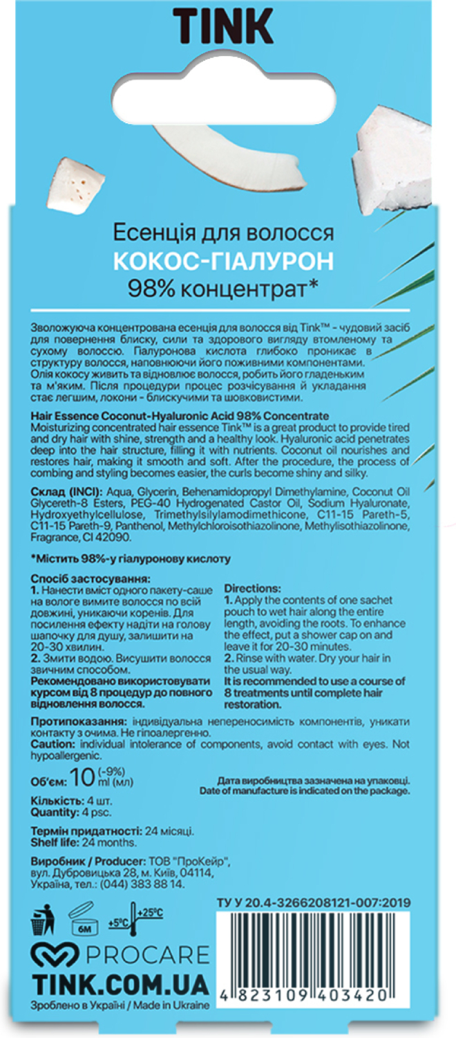 - Концентрована есенція для волосся Tink Кокос-Гіалурон 10 мл x 4 шт