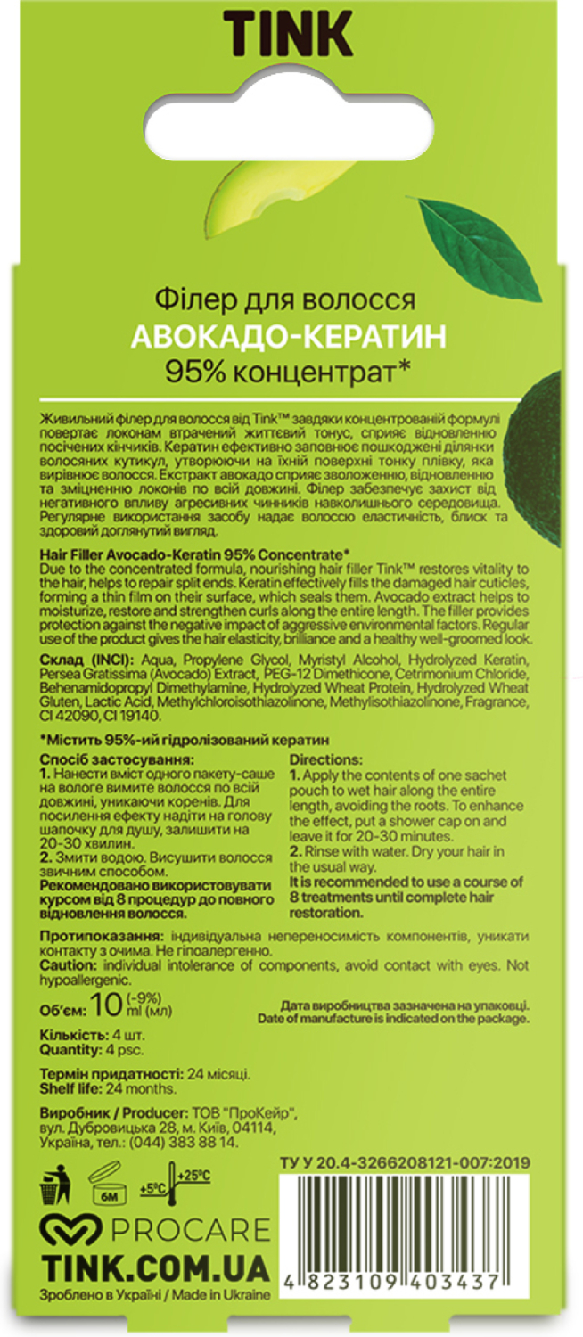 - Концентрований філер для волосся Tink Авокадо-Кератин 10 мл x 4 шт