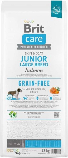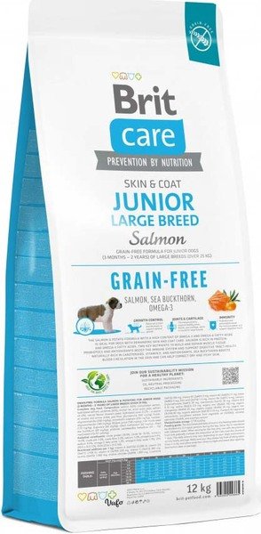 - Корм для молодих собак великих порід Brit Care Dog Grain-free Junior Large Breed беззерновий з лососем, 12 кг