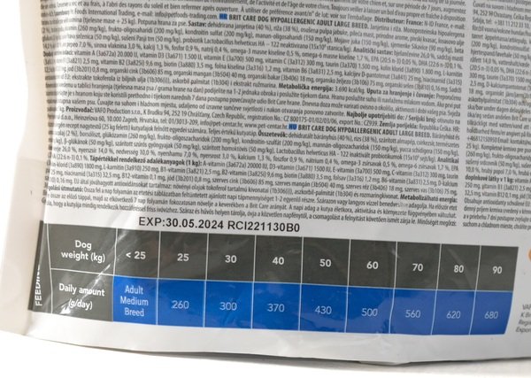 | Аналітичні компоненти | Сирий протеїн 26,0%, сирий жир 14,0%, вологість 10,0%, сира зола 7,0%, сира клітковина 3,0%, кальцій 1,3%, фосфор 0,9%, натрій 0,4 %, омега-3 жирні кислоти 0,5%, омега-6 жирні кислоти 1,7%, ЕПК (20:5 n-3) 0,05%, ДГК (22:6 n-3) 0,1% |