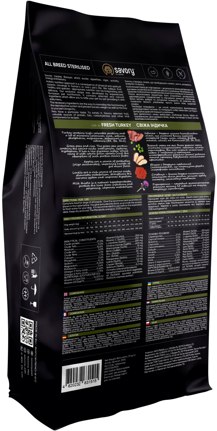 - Корм Savory All Breed Sterilised rich in Fresh Turkey сухий з індичкою для стерилізованих собак 12 кг
