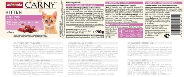 Carny Kitten Baby Paté для кошенят - це м'який вершковий паштет зі смачних, ніжних інгредієнтів з яловичини та курки. Ніжна кремоподібна консистенція полегшує перехід кошенят з материнського молока на тверду їжу. Carny Kitten Baby Paté спеціально адаптований до харчових потреб кошенят віком від 4 до 16 тижнів. Для виготовлення Carny Kitten Baby Paté використовуються стовідсотково свіжі м'ясні інгредієнти. Цей смачний паштет не містить цукру, злаків, штучних барвників і консервантів. Паштет стане ідеальним стартовим кормом для маленьких пухнастих вихованців.