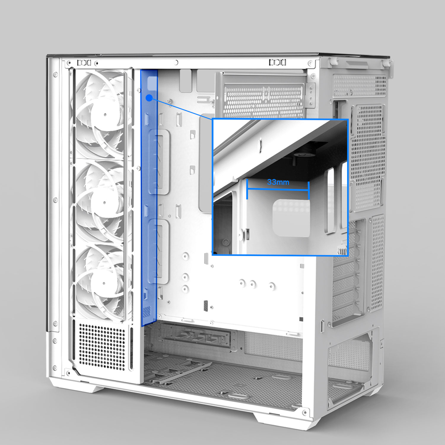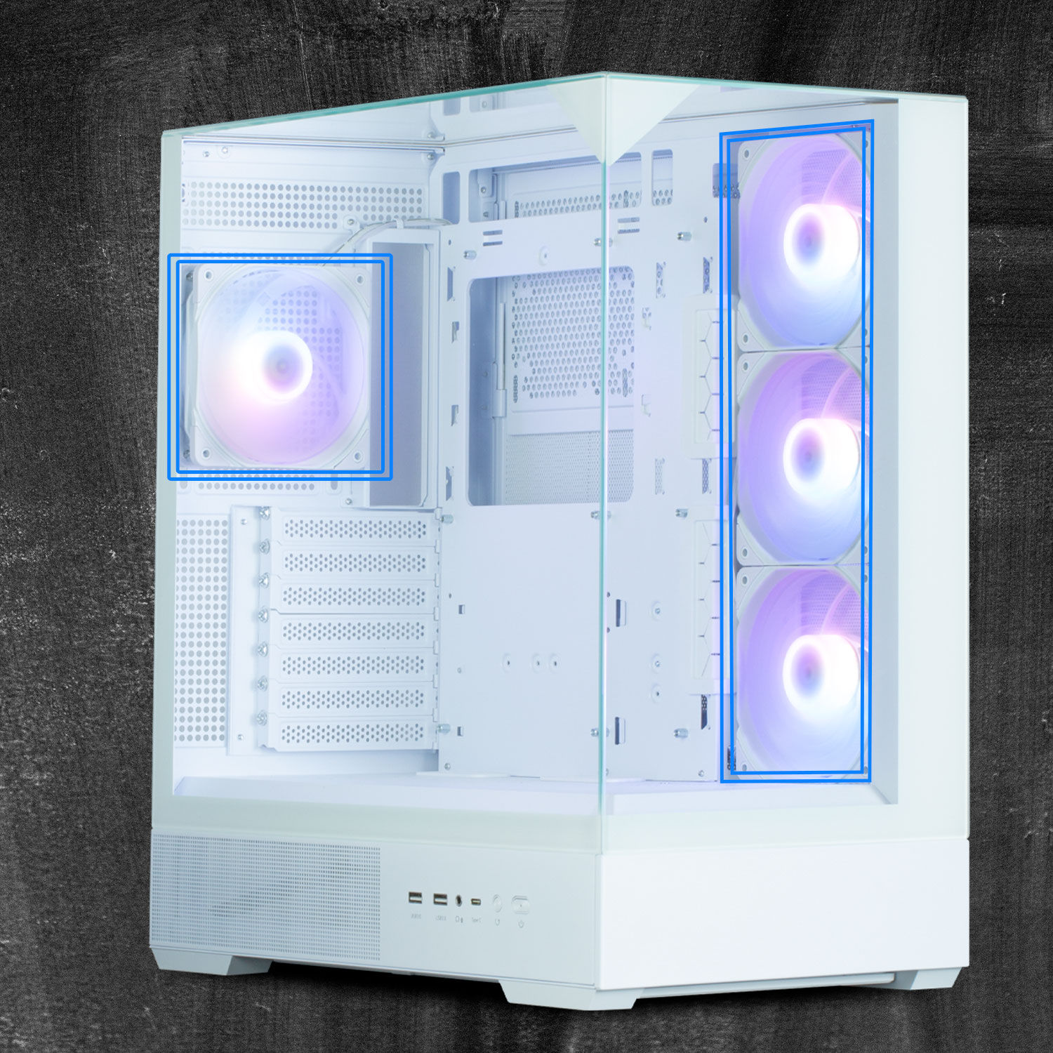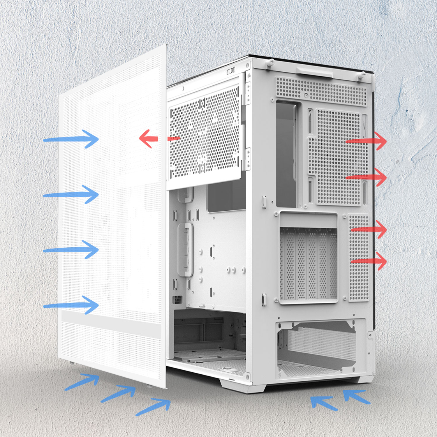 Конструкція з бічним всмоктуванням повітря в поєднанні з оптимізованим розміщенням вентиляторів забезпечує ідеальне охолодження та чудовий внутрішній повітряний потік.