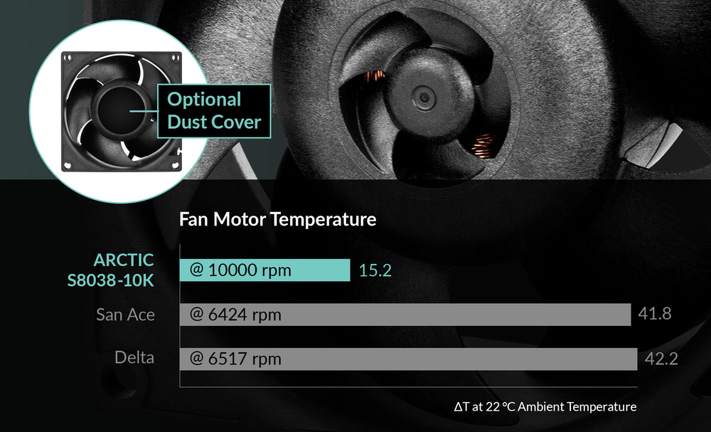 Температура двигуна, нижча на 10 °C, приблизно подвоює термін експлуатації. Двигун S8038-10K не тільки особливо ефективний, але й активно охолоджується додатковим робочим колесом у втулці вентилятора. У комплект постачання входить наклейка для втулки двигуна, яка забезпечує тривалий термін служби навіть у запилених середовищах.