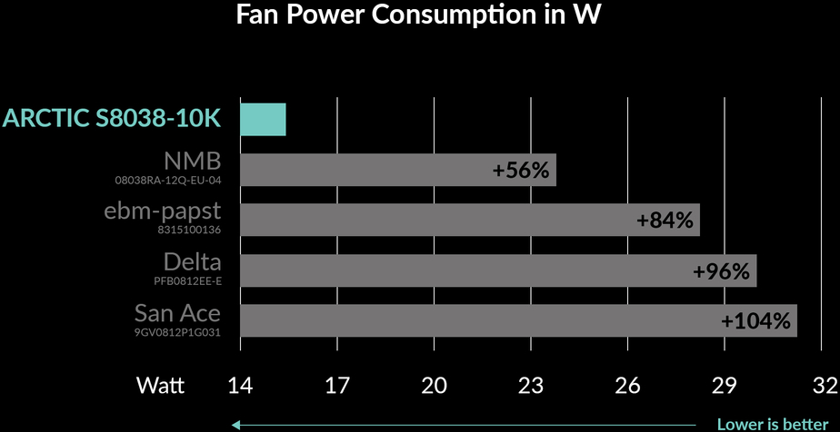 При однаковій продуктивності S8038 споживає на 25 % менше енергії, ніж найближчий конкурент, підвищуючи енергоефективність вашого сервера. Зниження енергоспоживання є результатом багатомісячної роботи інженерів ARCTIC над оптимізацією двигуна з метою підвищення ефективності ІТ-обладнання.