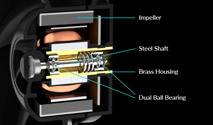 Ротор S8038-10K утримується двома високоякісними японськими кульковими підшипниками в міцному латунному корпусі. Така конструкція підвищує стабільність, міцність і перпендикулярність вентилятора та мінімізує чутливість до таких впливів, як тепло і пил. Крім того, латунний корпус допомагає зменшити знос високошвидкісних вентиляторів.