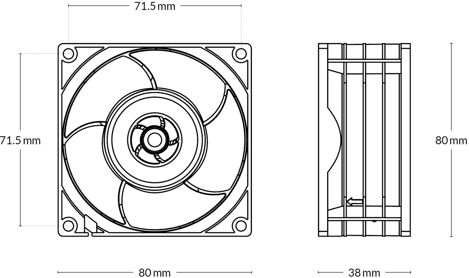S8038-10K пропонує широкий діапазон швидкості, який можна регулювати як за допомогою PWM, так і за допомогою напруги. Це дозволяє ідеально оптимізувати вентилятор відповідно до конкретних вимог системи. З діапазоном швидкості від 500 до 10000 об/хв він забезпечує ідеальний баланс між ефективністю охолодження та рівнем шуму, попри різні вимоги. Стандартне 4-контактне з'єднання додатково дозволяє підключати S8038-10K до 2-контактних або 3-контактних роз'ємів і, таким чином, керувати ним за допомогою напруги замість ШІМ. Кабель довжиною 30 см забезпечує чудову гнучкість при розміщенні вентилятора.