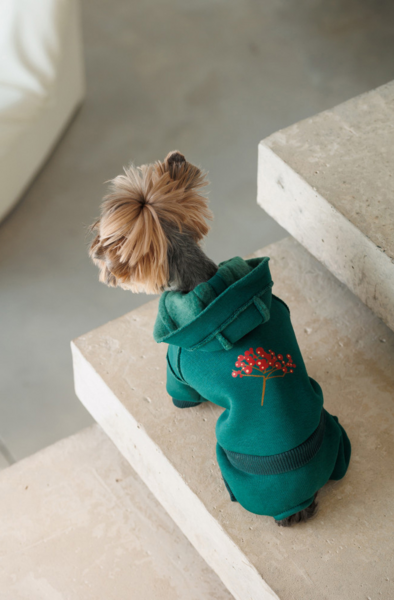 Модний смарагдовий колір, теплий та м’який матеріал, надзвичайно зручний крій – саме те, що потрібно стильним українським хвостикам для веселого дозвілля. Ягоди калини на спинці – не лише яскравий акцент, це один із найдавніших символів України, уособлення краси та добробуту, який підкреслює: українські песики – найкращі. В костюмі так приємно гуляти, так зручно бігати за іграшкою і гратися з іншими хвостиками, так цікаво досліджувати вулиці та парки рідного міста або їздити на природу. Утеплений трикотаж має м’який ворсистий виворіт, тож чудово зігріває і приємний до тіла. Капюшон дозволяє сховати голову та вушка від пронизливого вітру. Накладні шви не заважають і не куйовдять шерсть. Застібка на кнопках дуже зручна, дозволяє швидко вдягати навіть вередливих песиків.