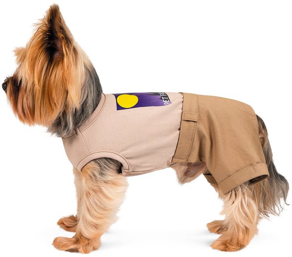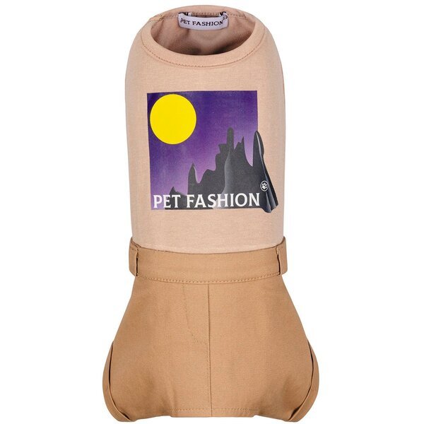 Костюм пісочного кольору з романтичною аплікацією на спинці. Поєднання приємних кольорів та декору підкреслить чарівність улюбленця. Резинка на животику гарантує чудову посадку. Бавовняна тканина дуже м’яка, завдяки їй костюм легко вдягти через голову без застібки.