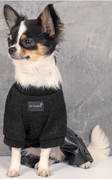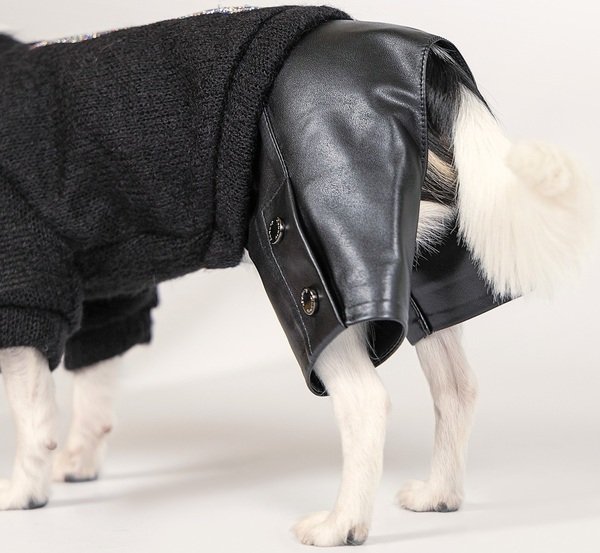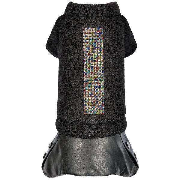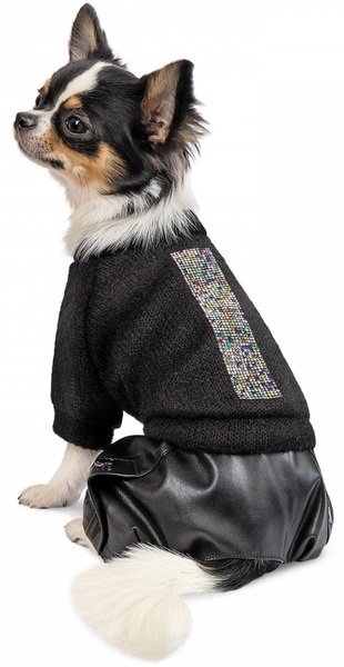 Ексклюзивна дизайнерська модель для досконалого ультрамодного образу та неймовірних фотосесій. Костюм Vogue створений, щоб почуватися в ньому зіркою. Завжди доречний чорний колір, сміливе поєднання напівпрозорого в'язаного трикотажу та екошкіри, смуга з розсипу кольорових стразів - цей костюм із претензією на найкращу модель у світі чотирилапих.
