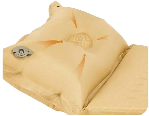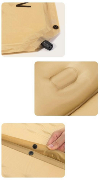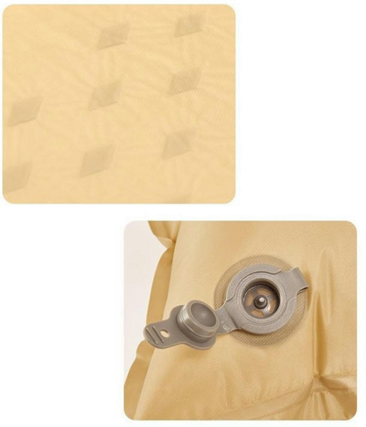 Самонадувний килимок розрахований на розміщення двох осіб. Для більшої зручності має надувні подушки. Товщина такого килимка всього 3 см, але він забезпечує комфортний відпочинок навіть на природі. Як матеріал використовується 190T ПВХ і губчастий шар з високою еластичністю. Поверхня жовтого кольору, стійка до вологи, що дає змогу використовувати матрац якомога довше.