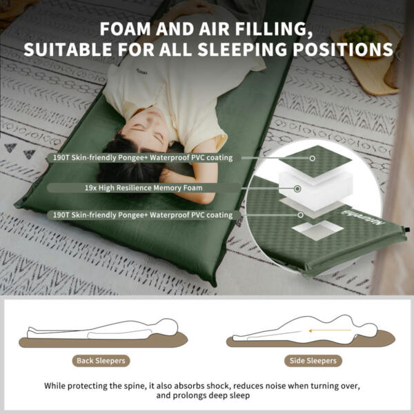 Килимок підходить для різних умов використання — від ночівель у наметі на пересіченій місцевості до пікніків і відпочинку на природі. Модель можна використовувати як окреме спальне місце в кемпінгу чи на пляжі або поєднувати з іншим аналогічним килимком за допомогою кнопок по краях виробу. Верхній шар виготовлений із гладкого епонжу 190T із пінним наповнювачем. Ключова перевага килимка — ортопедичні властивості, завдяки яким він рівномірно розподіляє вагу тіла, підтримує хребет у правильному положенні та знижує навантаження на суглоби й м'язи під час сну.