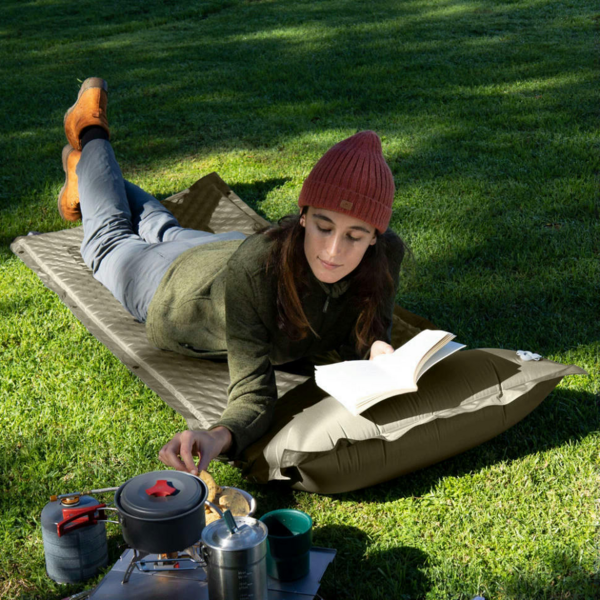 Ви плануєте активний відпочинок на природі разом із друзями чи у сімейному колі? Вирушаєте у пішу подорож з наметом? Тоді самонадувний килимок стане тим елементом спорядження, який забезпечить комфортний сон, ніби ви не покидали свою домівку. У надутому положенні розміри килимка сягають 192х65 см. За бажанням його можна застебнути з другим аналогічним виробом, щоб збільшити місце для сну. Висота килимка становить 6 см, тому дрібні нерівності поверхні, як каміння, гілки або шишки, не відчуваються під час використання, сприяючи здоровому відпочинку, де б ви не знаходилися.