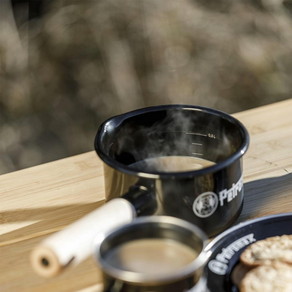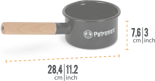 Легкий емальований ківш із дерев'яною ручкою від німецького бренду Petromax. Однаково підходить для готування на природі та вдома, сумісний з усіма джерелами тепла, крім багаття. Призначений для швидкого приготування простих страв - на відміну від фірмових чавунних жаровень Petromax, що мають високу теплоємність і слугують для довготривалого прогрівання їжі. Зручна посудина для каші, пасти, бульйону, соусу, напоїв (какао, киселю, глінтвейну).