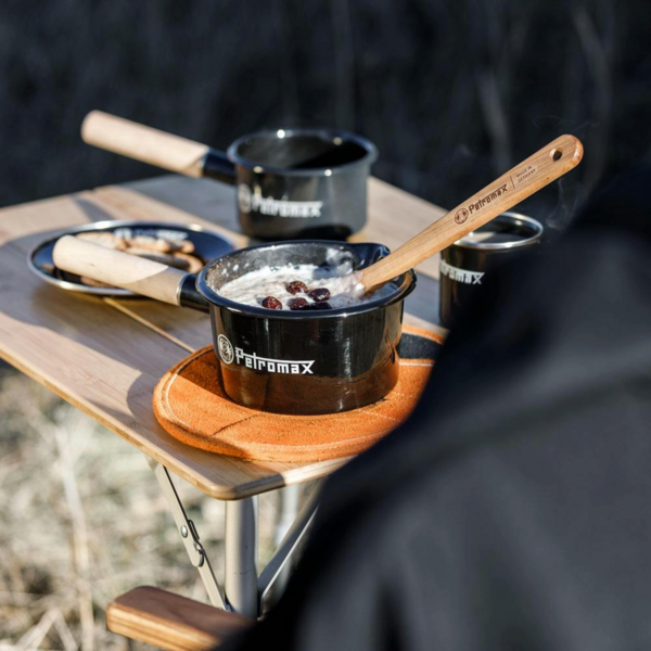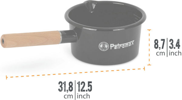 Легкий емальований ківш із дерев'яною ручкою від німецького бренду Petromax. Однаково підходить для готування на природі та вдома, сумісний з усіма джерелами тепла, крім багаття. Призначений для швидкого приготування простих страв - на відміну від фірмових чавунних жаровень Petromax, що мають високу теплоємність і слугують для довготривалого прогрівання їжі. Зручна посудина для каші, пасти, бульйону, соусу, напоїв (какао, киселю, глінтвейну).