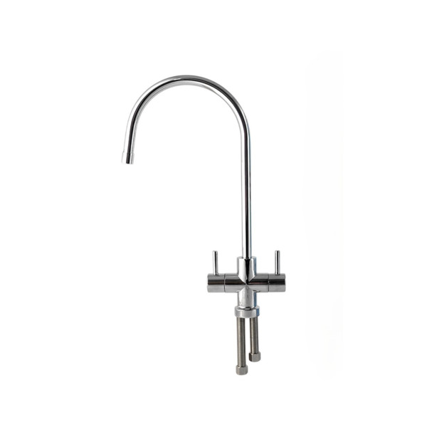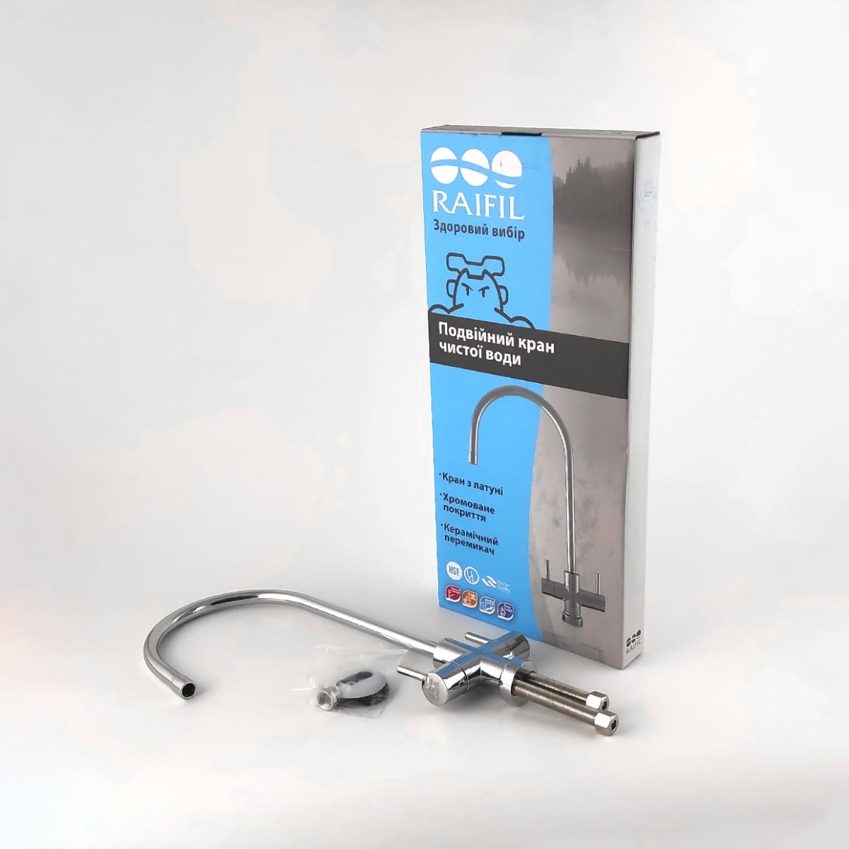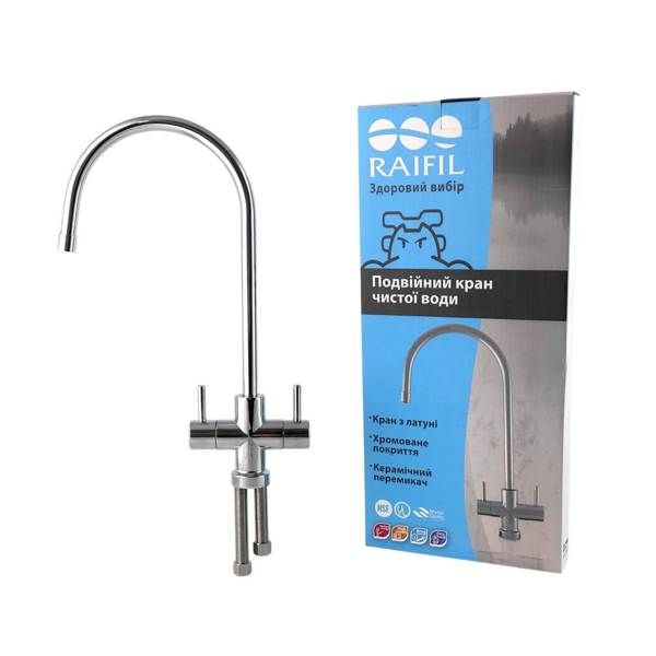 Кран чистої води F-09 Raifil Duo призначений для подачі очищеної та додатково мінералізованої води після систем зворотного осмосу. Виготовлений з латуні з хромованим покриттям та оснащений двома вентилями для роздільної подачі води. Монтується на кухонну мийку або стільницю. Підключається до побутових систем фільтрації через різьбове з’єднання 1/4".