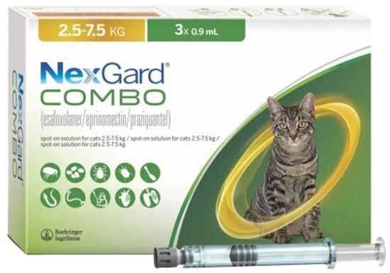 NexGard Combo призначений для боротьби та профілактики зараження блохами, кліщами (у тому числі вушними) та гельмінтами у кішок. Його рекомендують застосовувати, коли тварина страждає одночасно від зовнішніх та внутрішніх паразитів або є обґрунтована підозра на таку проблему. Препарат NexGard Combo знищує кліщів та оберігає від повторного зараження від місяця до 5 тижнів (залежно від виду), а бліх знищує настільки швидко, що вони не встигають відкласти яйця. Такий же жорстокий NexGard Combo і до глистів. Дивовижний препарат нового покоління очистить організм кота від більшості видів паразитів тільки за одне приймання! Препарат також ефективний при лікуванні лишаю. Три діючі речовини у складі препарату ефективно борються не лише з дорослими особинами паразитів, а й з їх личинками. Котів необхідно обробляти від паразитів, інакше вони розмножуються дуже швидко і в критичній кількості можуть завдати здоров'ю вихованця непоправної шкоди. NexGard Combo можна використовувати не тільки для дорослих котів, але і для кошенят у період активного росту: застосування дозволено для тварин 8 тижнів від народження та вагою від 0,8 кг. NexGard Combo використовують для лікування стрічкових, шлунково-кишкових гельмінтів, ефективний він і при лікуванні інфекцій, викликаних легеневими гельмінтами, застосовується для профілактики дирофіляріозу. Зараження тварин одночасно різними видами паразитів – велика проблема і NexGard Combo надійний помічник у боротьбі з ним.