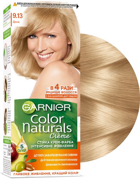 Крем-фарба Garnier Color Naturals 9.13 Дюна допоможе вам домогтися дуже світлого, теплого відтінку блонда без обтяження волосся. Це перша на ринку косметика такого роду, яка забезпечує фарбованому волоссю подвійний захист структури волосся і бажаного кольору. Стійкий ефект фарбування і добре кондиціоноване волосся - це можливо!