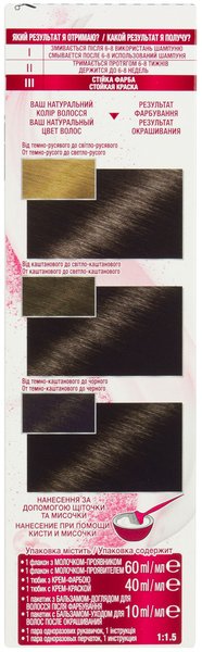 | Комплектація (можливі зміни в різних поставках) | Фарбуючий крем, Рукавички |