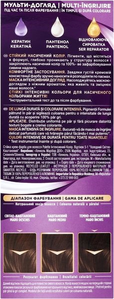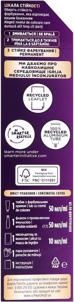 Стійка крем-фарба Palette Intensive Color Crème Інтенсивний колір надійно зафарбовує сивину, залишаючи волосся здоровим і доглянутим. Розроблено спеціально для жінок, які хочуть отримати насичений і стійкий колір волосся. Впевнена в кольорі - впевнена в собі. Оновлена формула з високоінтенсивними пігментами глибоко проникає в структуру волосся, захищаючи колір від вимивання.