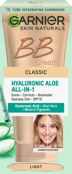 Комплексний зволожувальний крем Garnier Skin Naturals - догляд, поданий у відтінку, що ідеально адаптується до тону шкіри. Комбінація гіалуронової кислоти натурального походження, з органічним алое вера та мінеральними пігментами у BB-кремі для нормальної шкіри обличчя світло-бежевого відтінку має легку формулу, яка вирівнює тон шкіри, зволожує і захищає від сонця.