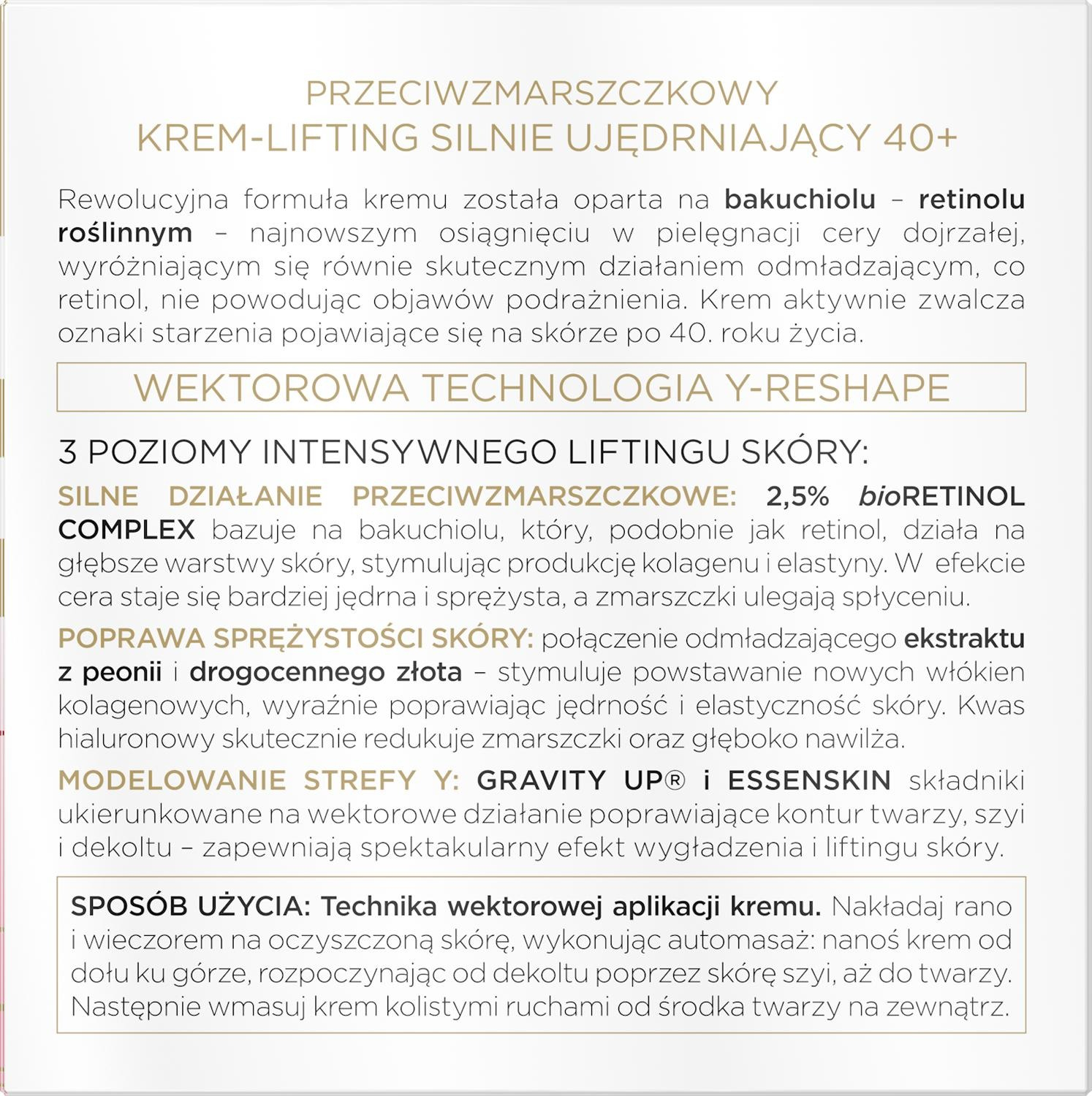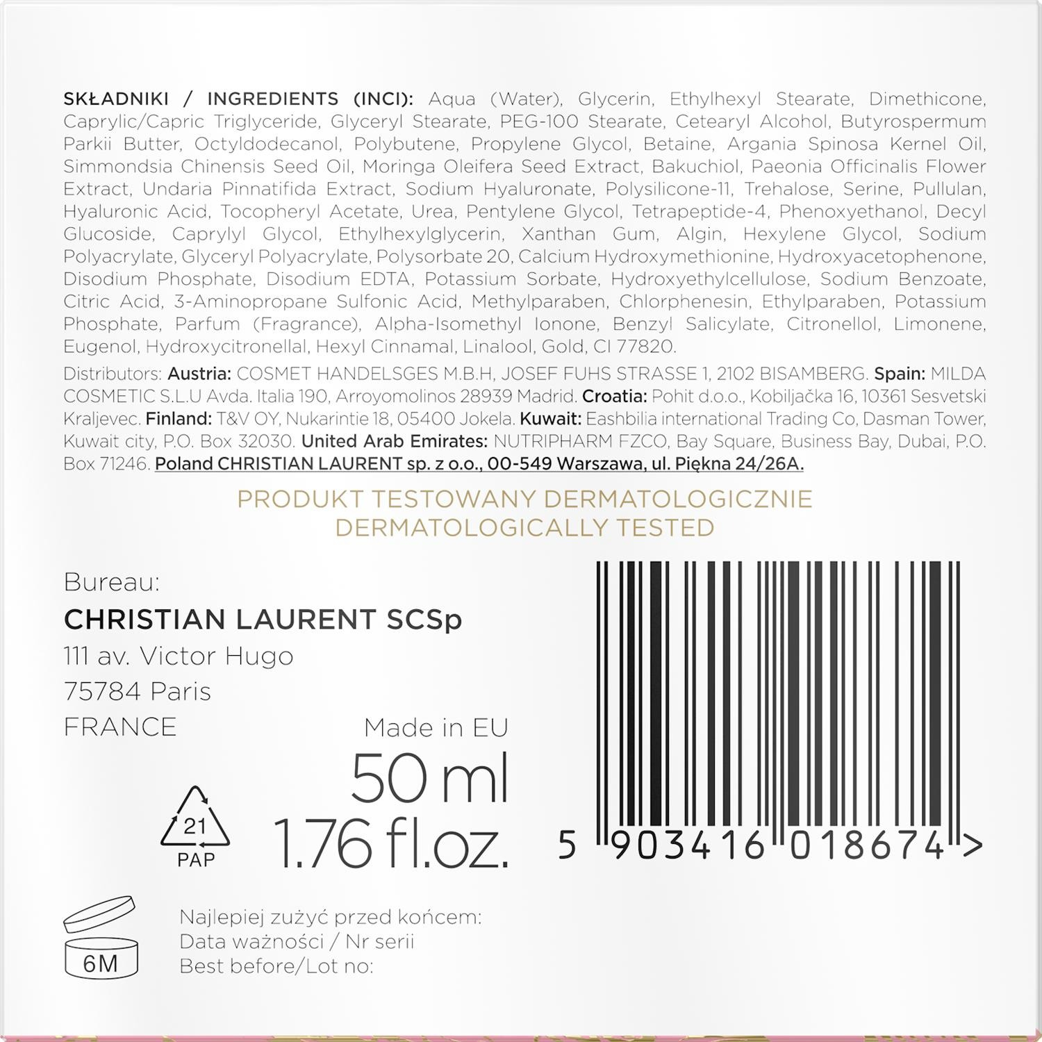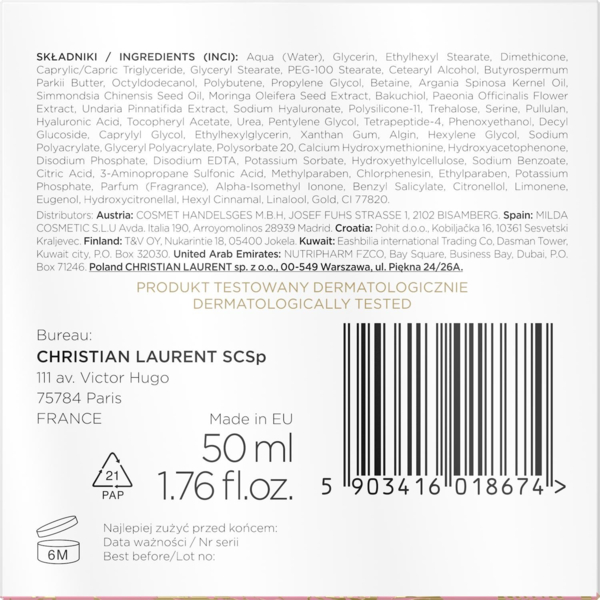 | Склад | Aqua, Glycerin, Ethylhexyl Stearate, Dimethicone, Caprylic/Capric Triglyceride, Glyceryl Stearate, PEG-100 Stearate, Cetearyl Alcohol, Butyrospermum Parkii Butter, Octyldodecanol, Polybutene, Propylene Glycol, Betaine, Argania Spinosa Kernel Oil, Simmondsia Chinensis Seed Oil, Moringa Oleifera Seed Extract, Bakuchiol, Paeonia Officinalis Flower Extract,, Hydroxyacetophenone, Disodium Phosphate, Disodium EDTA, Potassium Sorbate, Hydroxyethylcellulose, Sodium Benzoate, Citric Acid, 3-Aminopropane Sulfonic Acid, Methylparaben, Chlorphenesin, Ethylparaben, Potassium Phosphate, Parfum (Fragrance), Alpha-Isomethyl Ionone, Benzyl Salicylate, Citronellol, Limonene, Eugenol, Hydroxycitronellal, Hexyl Cinnamal, Linalool, Benzyl Alcohol, Geraniol, Gold, CI 77820, Undaria Pinnatifida Extract, Sodium Hyaluronate, Polysilicone-11, Trehalose, Serine, Pullulan, Hyaluronic Acid, Tocopheryl Acetate, Urea, Pentylene Glycol, Tetrapeptide-4, Phenoxyethanol, Decyl Glucoside, Caprylyl Glycol, Ethylhexylglycerin, Xanthan Gum, Algin, Hexylene Glycol, Sodium Polyacrylate, Glyceryl Polyacrylate, Polysorbate 20, Calcium Hydroxymethionine, |