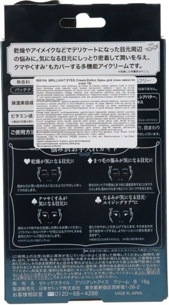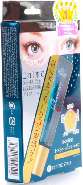 Багатофункціональний крем Zettoc Brilliant Eyes одночасно доглядає за ніжною шкірою навколо очей і віями! Ніжний крем зволожує шкіру навколо очей, маскує припухлості, набряки та кола під очима. Рекомендується використовувати не тільки на ніч, а й вранці перед нанесенням макіяжу. Можна використовувати також поверх макіяжу для зволоження протягом дня. Не містить ароматизаторів, барвників, парабенів, мінеральних і тваринних олій. Застосовується для зони біля очей. Цінні олії ши та макадамії живлять клітини, а екстракт мигдалю та вівсяних зерен нормалізує їхній гідроліпідний баланс. Соєві ізофлавони активізують природний синтез колагену й еластину, які сприяють інтенсивним процесам регенерації та вирівнюють дрібні мімічні зморшки.
