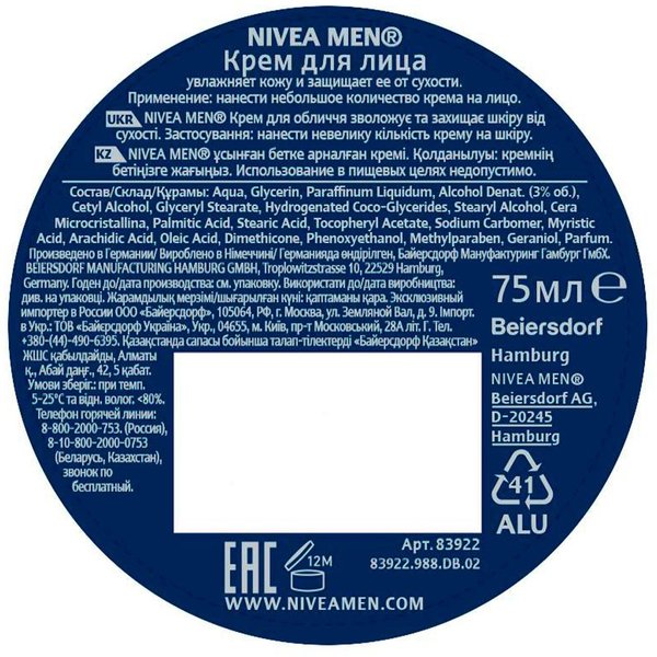 Схожі товари Крем для обличчя Nivea Men для чоловічої шкіри 75мл